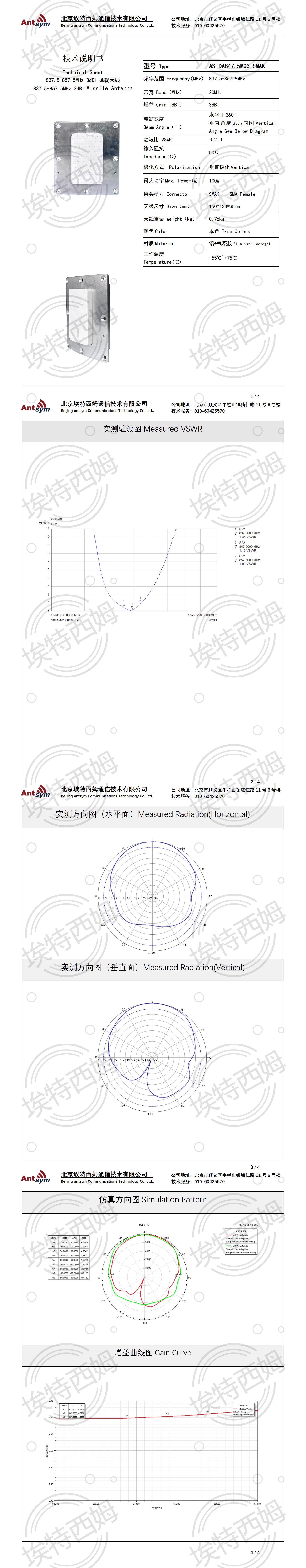 837.5-857.5MHz 3dBi 弹载天线